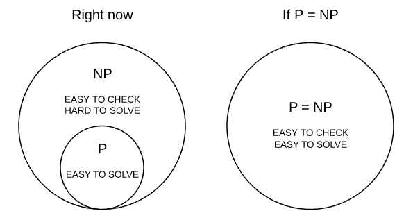 ‘P’ refers to those problems that are fast (hence easy) for a computer to solve. ‘NP’ refers to those problems that are fast (hence easy) for a computer to check but not necessarily easy to solve in the first place. You will have to keep this in mind, so here is a shortcut to remember it – ‘P’ = fast to solve and ‘NP’ = fast to check.